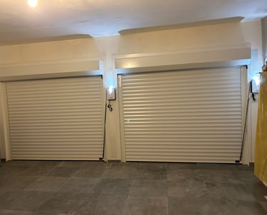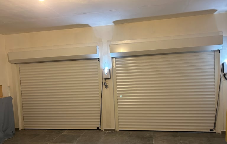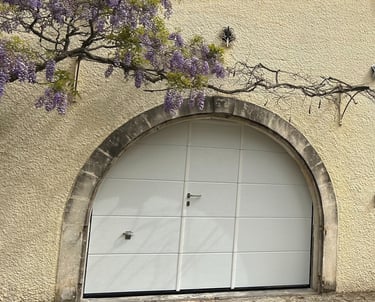 Le tablier se lève, sans s'enrouler, et coulisse le long de rails parallèles fixés au plafond.