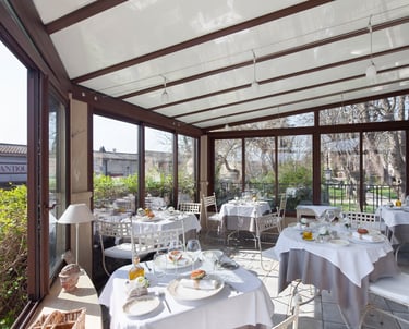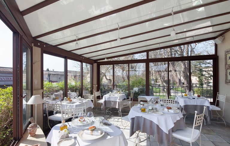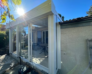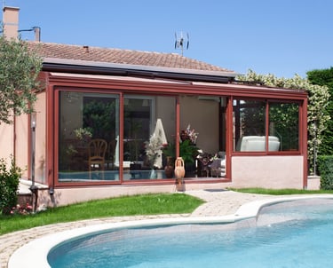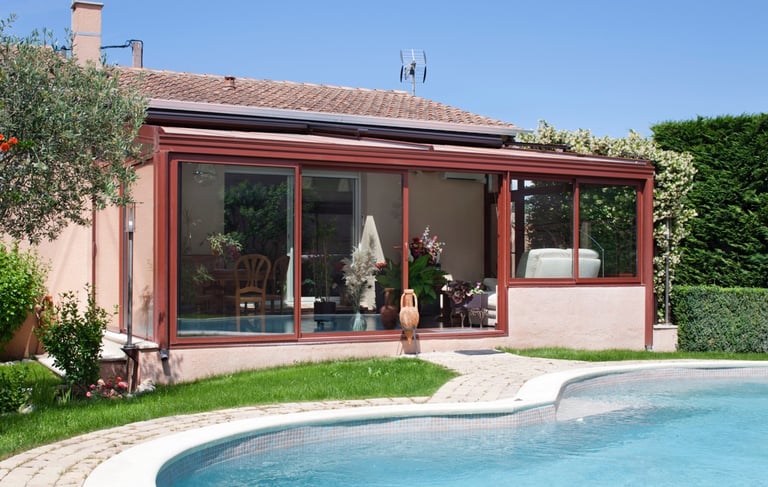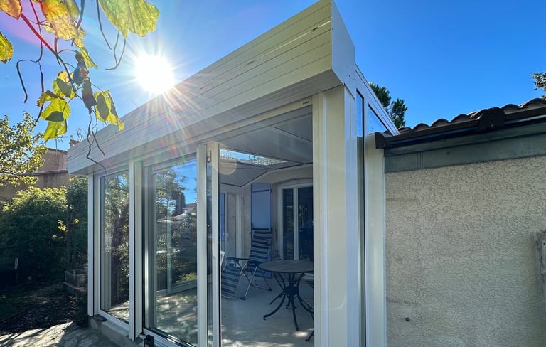 Véranda avec toiture vitrée et volets roulants intégrés pour un esprit libre et sécurisant.